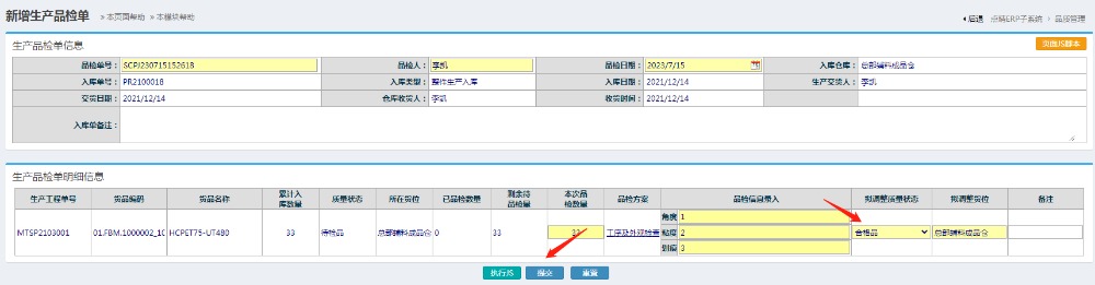 进入界面后,填入对应的信息,若出货前需要做品检,则质量状态选“出货待检”,若出货前无需建议,则选“合格品”,选好设置,点击提交完成操作。