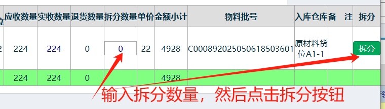 查询出要拆分的入库单,然后点击入库单号 如下图: