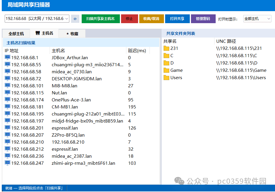 快速盘点局域网内哪些机器开了共享、共享了什么,主机名 Tab 顺便给出在线主机清单和延迟,排查异常共享也方便。