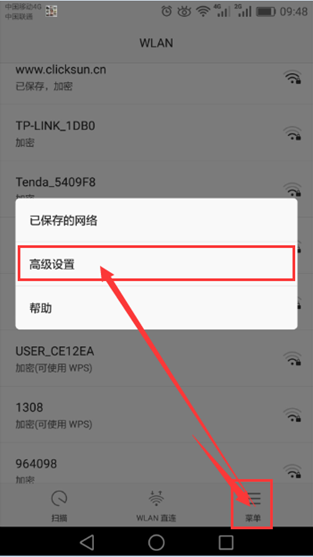 4.1.2、进入后点击“菜单”——选择“高级设置”(部分手机可直接点击“高级设置”)4.1.3、进入菜单点击“在休眠状态下保持WLAN”连接,4.1.4、进入菜单后选择“始终”,如下图所示: QQ图片20180123101700.png)