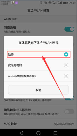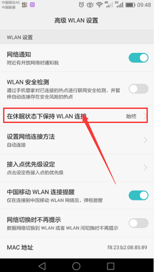 4.1. 点击“设置 > WLAN > 高级设置 > 在休眠状态下保持WLAN连接”。