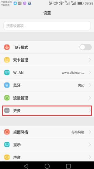 4.2. 点击“设置 > 更多(无线和网络)移动网络 > 始终连接数据业务”。并将WLAN/移动数据连接切换提示选择为“自动使用移动数据连接”。 操作图示: 4.2.1、打开设置——选择“更多”进入,如下图: QQ图片20180123101718.png)