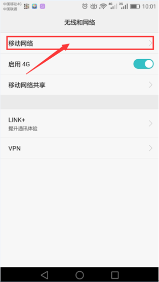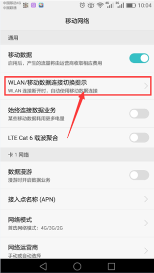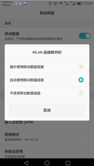 4.2.2、进入菜单后——选择移动网络,4.2.3、选择“WLAN/移动数据连接切换提示”,4.2.4、点击选择“自动使用移动数据连接”,如下图所示: QQ图片20180123101811.png)