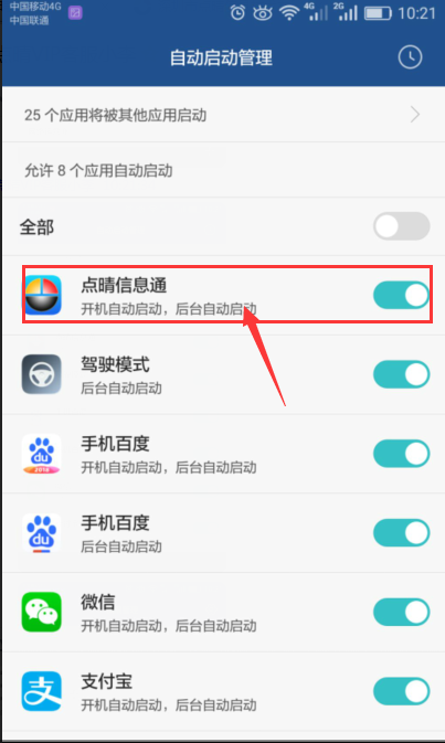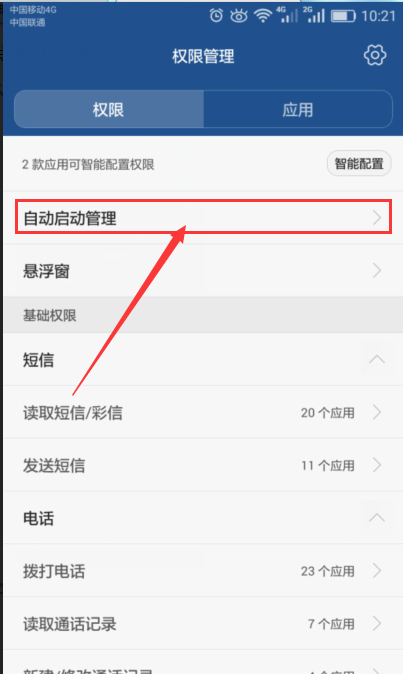 点击“设置 > 权限管理 > 自动启动管理(开机自动启动)”,将点晴信息通设置成允许开机自动启动。