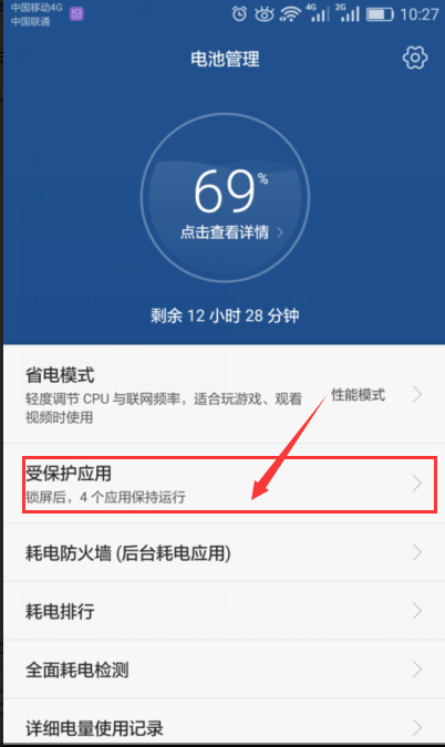 1.2、进入页面后,选择“电池管理” 1.3、进入页面后——选择“受保护应用”1.4、进入页面,选择“点晴信息通”——设置保护,如下图所示: