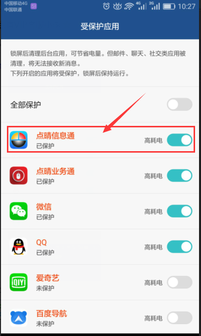 MUI4.0及EMUI4.1:点击“设置 > 高级设置 > 电池管理 > 受保护应用”,将点晴信息通设置成已保护。