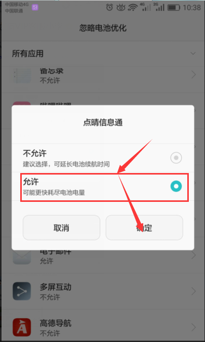 、允许点晴信息通忽略电池优化: