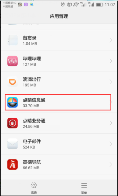2.2、进入页面——点击高级 2.3、进入页面——选择“忽略电池优化”2.4、进入页面后,默认显示“允许”程序,切换查出所有应用 2.5、找到点晴信息通,设置允许,如下图所示: QQ%E5%9B%BE%E7%89%8720180123104507.png)