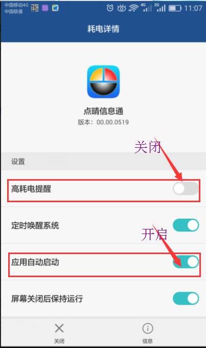 .、当有点晴信息通高耗电提醒的时候,选择不再提示,不要关闭应用。点击“设置 > 应用管理 > 点晴信息通 > 电池”,选择关闭高耗电提醒。 (仅EMUI4.0以上平台适用)