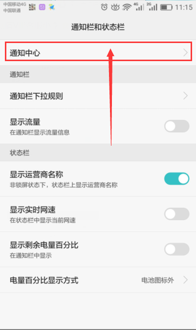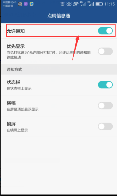 MUI4.0及EMUI4.1:“设置 > 通知栏和状态栏 > 通知中心 > 点晴信息通”。 3.2.1、点击设置进入页面,3.2.2、选择“通知栏和状态栏”,3.2.3、进入页面——选择“通知中心”, 3.2.4、进入页面——选择启用“允许通知”,如下图所示: QQ图片20180123112408.png)