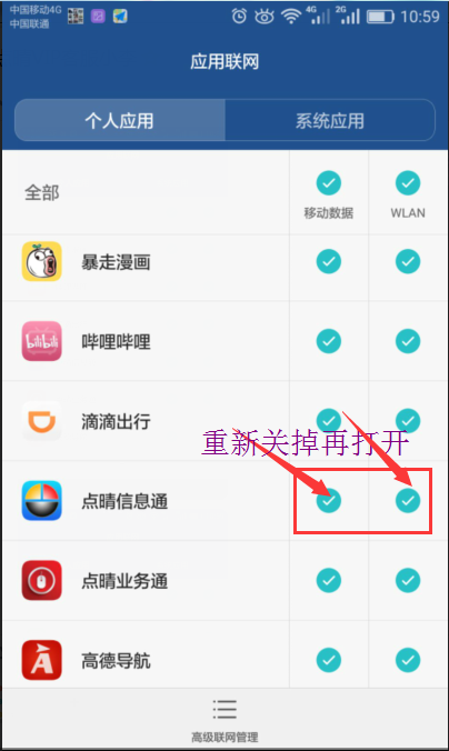 点击“设置 > 流量管理 > 应用联网管理”,找到点晴信息通,然后把点晴信息通的移动数据和 WLAN 选项,重新进行勾选。