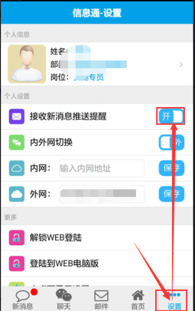 3.1.开启点晴信息通应用内部的通知功能,“设置 -> 开启新消息提醒”;