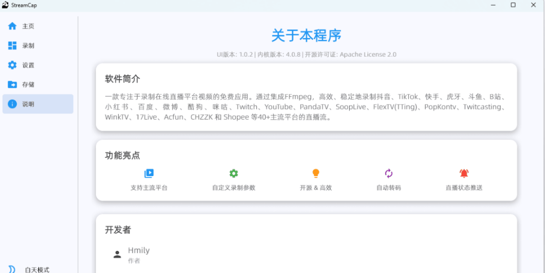 StreamCap是一个基于FFmpeg和StreamGet的多平台直播流录制客户端,覆盖40+国内外主流直播平台,支持批量录制、循环监控、定时监控和自动转码等功能。百度网盘:链接:https://pan.baidu.com/s/1F1rdb5e4I0MS4XIBQdqsag?pwd=6666​提取码:6666