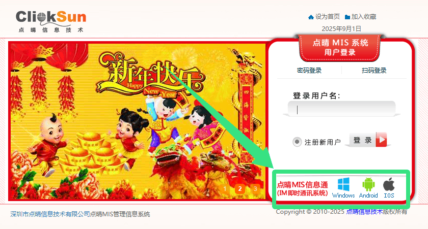 点晴MIS信息通手机APP或PC客户端下载地址如下:登录首页点击“点晴MIS信息通”或登录进入点晴MIS系统,点击右上角手机图标:出现下载页面: