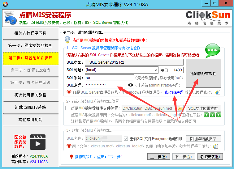 请问修改数据库密码需要修改哪几个地方? 重新安装配置一下点晴MIS系统即可,安装教程和安装程序下载地址:http://install.oa22.cn。重新安装时,不需要卸载当前点晴MIS系统,直接重新安装配置即可,安装过程中,在以下界面输入新的SQLServer登录账号和密码,安装程序就会自动将所有需要用到数据库登录...