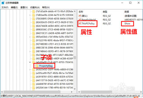 2、下面的修改方法都是一样的,都是找到文件夹在注册表中的表示形式,修改其子项【PropertyBag】的属性“ThisPCPolicy”的值,把属性值从“Show”修改为“Hide”。