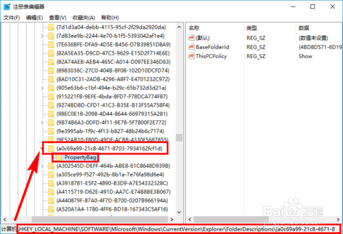 在注册表编辑器中依次找到【HKEY_LOCAL_MACHINE\SOFTWARE\Microsoft\Windows\CurrentVersion\Explorer\FolderDescriptions\{a0c69a99-21c8-4671-8703-7934162fcf1d}\PropertyBag】,步骤截图如下所示: