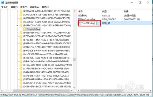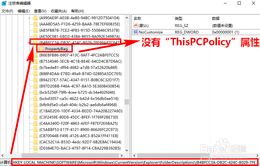 在注册表编辑器中依次找到【HKEY_LOCAL_MACHINE\SOFTWARE\Microsoft\Windows\CurrentVersion\Explorer\FolderDescriptions\{B4BFCC3A-DB2C-424C-B029-7FE99A87C641}\PropertyBag】,这个文件夹有些特殊,你发现没有“ThisPCPolicy”。
